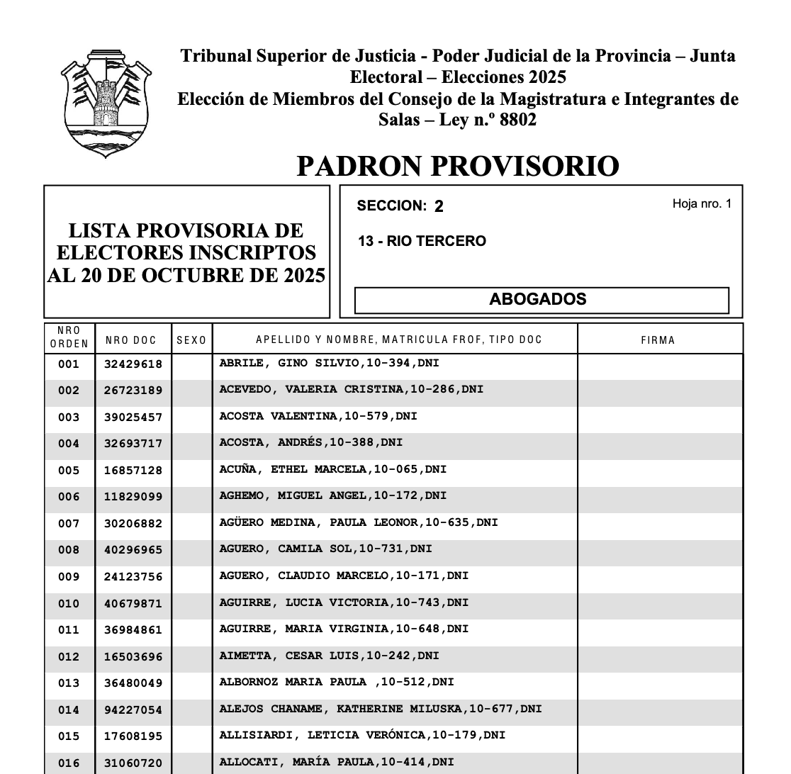 Padrón provisorio – Elección de Miembros del Consejo de la Magistratura e Integrantes de Salas – Ley n.o 8802